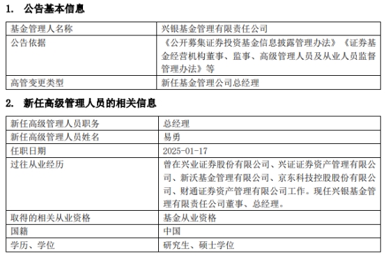 公告显示,易勇曾在兴业证券股份有限公司、兴证证券资产管理有限公司、新沃基金管理有限公司、京东科技控股股份有限公司、财通证券资产管理有限公司工作。现任兴银基金管理有限责任公司董事、总经理。