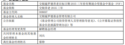 中国经济网北京1月22日讯 今日,交银施罗德基金管理有限公司公告,蔡铮离任交银养老2035三年,刘兵管理。