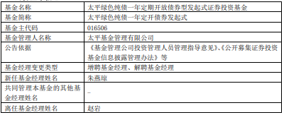 中国经济网北京1月27日讯 近日,太平基金管理有限公司公告,太平绿色纯债一年定开债券发起式增聘朱燕琼,赵岩离任。