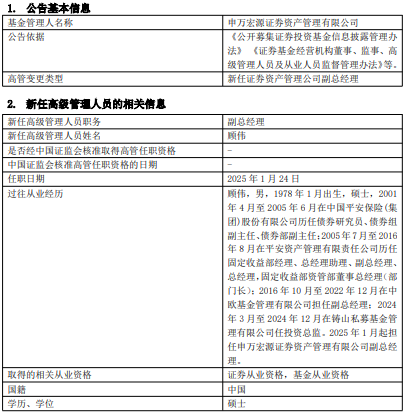 公告显示,顾伟2001年4月至2005年6月在中国平安保险(集团)股份有限公司历任债券研究员、债券组副主任、债券部副主任;2005年7月至2016年8月在平安资产管理有限责任公司历任固定收益部经理、总经理助理、副总经理、总经理,固定收益部资管部董事总经理(部门长);2016年10月至2022年12月在中欧基金管理有限公司担任副总经理;2024年3月至 2024年12月在铸山私募基金管理有限公司任投资总监。2025年1月起担任申万宏源证券资产管理有限公司副总经理。