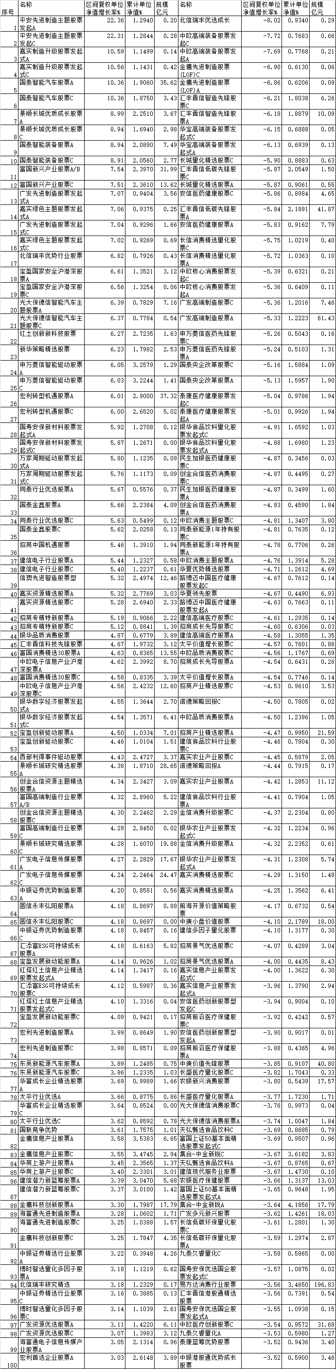 平安先进制造主题股票发起A、平安先进制造主题股票发起C、嘉实制造升级股票发起式A、嘉实制造升级股票发起式C、国泰智能汽车股票A、国泰智能汽车股票C成为上涨第一梯队,涨幅分别为22.36%、22.31%、10.59%、10.56%、10.36%、10.36%。