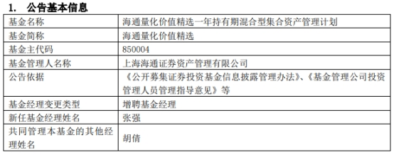 中国经济网北京2月7日讯 今日,上海海通证券资产管理有限公司公告称,海通量化成长精选(A类851088、B类850010、C类851099)、海通量化价值精选(A类850088、B类850004、C类850099)、海通智选(A类850788、B类850007、C类850799)、海通策略优选(A类852200、C类852289)增聘基金经理张强。