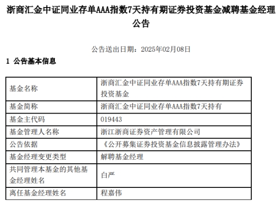 程嘉伟离任浙商汇金中证同业存单AAA指数7天持有