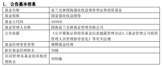 中国经济网北京2月14日讯 今日,国海富兰克林基金管理有限公司公告称,国富强化收益债券(A类450005;C类450006)增聘基金经理刘晓。