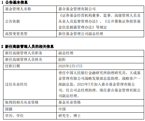 中国经济网北京2月19日讯 今日,嘉合基金管理有限公司公告,任命赵阳为副总经理。