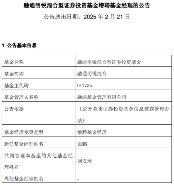 中国经济网北京2月21日讯 今日,融通基金管理有限公司公告称,融通明锐混合(A类017735;C类017736)增聘基金经理张鹏。