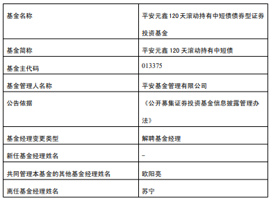 中国经济网北京2月21日讯 今日,平安基金管理有限公司公告,苏宁离任平安元鑫120天滚动持有中短债,欧阳亮管理。