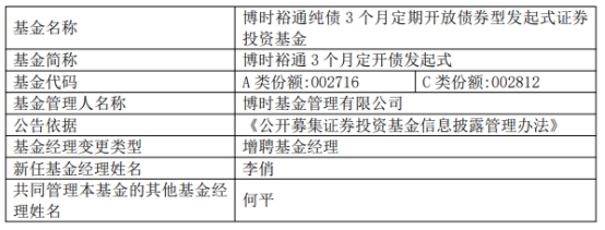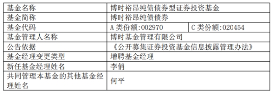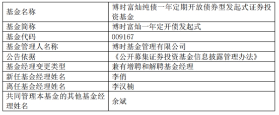 中国经济网北京2月25日讯 今日,博时基金管理有限公司公告称,博时裕昂纯债债券(A类002970;C类020454)、博时裕通3个月定开债发起式(A类002716;C类002812)、博时富灿一年定开债发起式(009167)增聘基金经理李俏,李汉楠离任博时富灿一年定开债发起式。