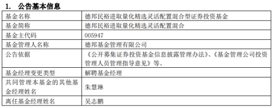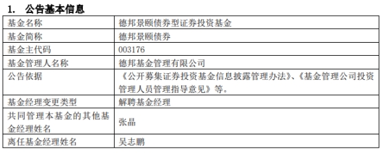 德邦基金吴志鹏离任2只基金