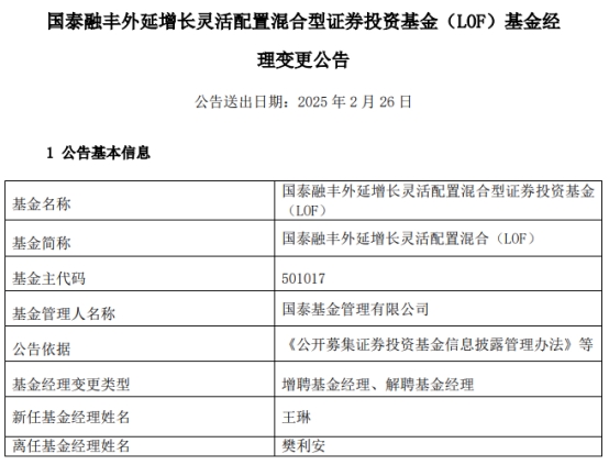 国泰融丰外延增长灵活配置混合增聘王琳 樊利安离任