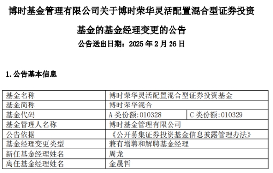 博时荣华混合增聘周龙 金晟哲离任