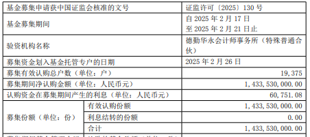 募集期间净认购金额1,433,530,000.00元,认购资金在募集期间产生的利息60,751.08元,募集份额合计1,433,530,000.00份。