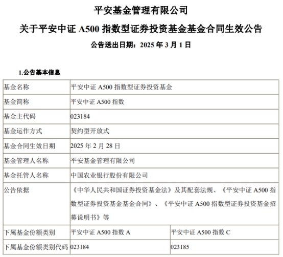 中国经济网北京3月3日讯 近日,平安基金管理有限公司发布关于平安中证A500指数型证券投资基金基金合同生效公告。