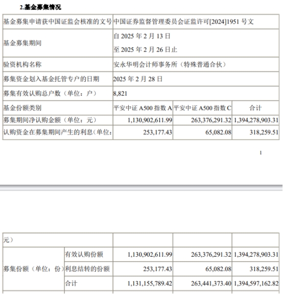 该基金募集期间净认购金额合计1,394,278,903.31元,认购资金在募集期间产生的利息合计318,259.51元,募集份额合计1,394,597,162.82份。