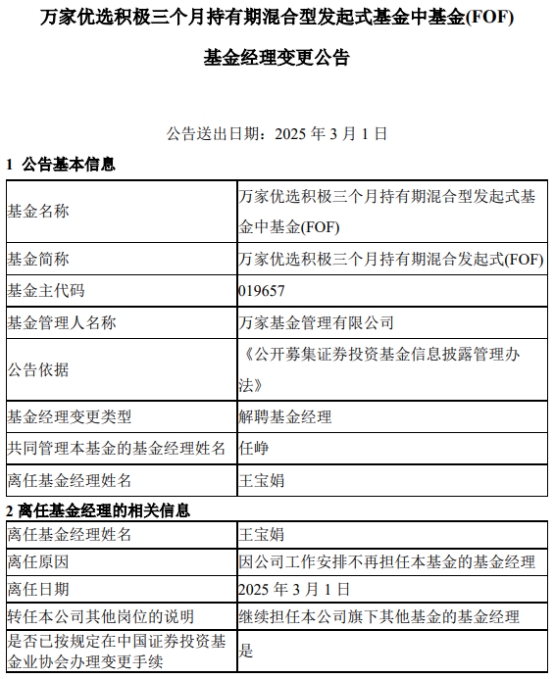 中国经济网北京3月3日讯 近日,万家基金管理有限公司公告称,王宝娟离任万家优选积极三个月持有期混合发起式(FOF)(A类019657;C类019658)。
