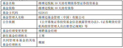 中国经济网北京3月3日讯 近日,路博迈基金(中国)公告,路博迈悦航30天持有期债券增聘王寒。
