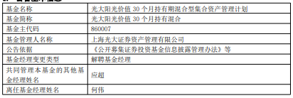 中国经济网北京3月3日讯 今日,上海光大证券资产管理有限公司公告,何伟离任光大阳光价值30个月持有混合。