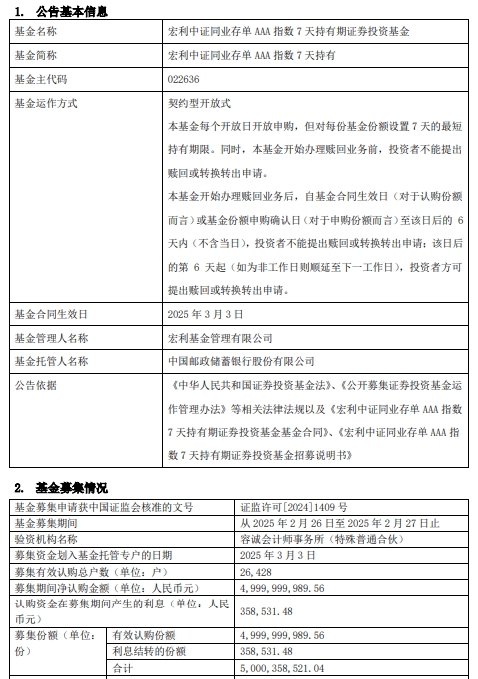 宏利中证同业存单AAA指数7天成立 规模50亿元