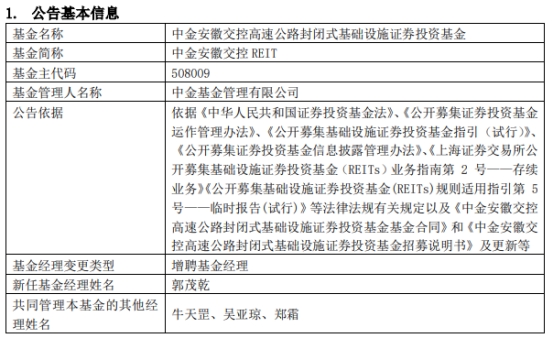 中国经济网北京3月4日讯 今日,中金基金管理有限公司公告称,中金安徽交控REIT(508009)增聘郭茂乾。