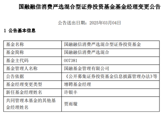 中国经济网北京3月4日讯 今日,国融基金管理有限公司公告称,国融融信消费严选混合(A类007381;C类007382)增聘许银丰。