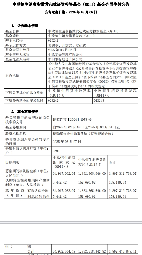 中国经济网北京3月10日讯 近日,中欧基金管理有限公司发布中欧恒生消费指数发起式证券投资基金(QDII)基金合同生效公告。
