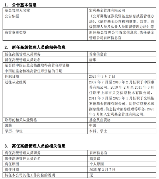 中国经济网北京3月10日讯 近日,宏利基金管理有限公司发布基金行业高级管理人员变更公告。公告称,唐华任公司首席信息官,原首席信息官高贵鑫因个人原因于2025年3月7日离任。
