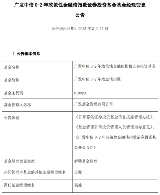 中国经济网北京3月11日讯 今日,广发基金管理有限公司公告称,吴迪离任广发中债0-2年政策性金融债(A类019929;C类019930)。