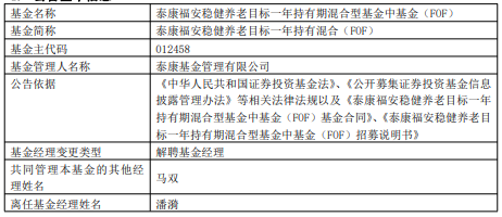潘漪离任泰康福安稳健养老目标一年持有混合FOF