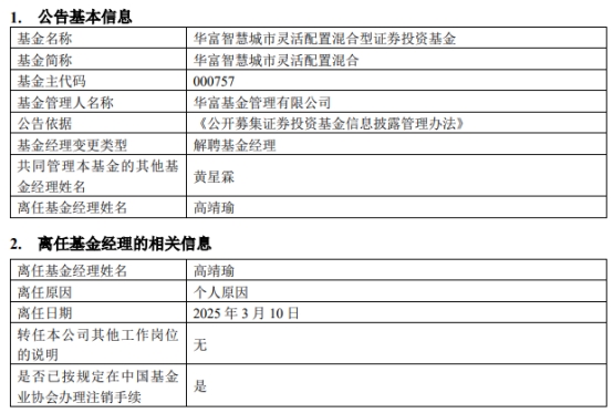 中国经济网北京3月11日讯 今日,华富基金管理有限公司公告称,高靖瑜离任华富智慧城市灵活配置混合(A类000757;C类020486)。