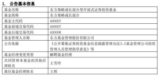 中国经济网北京3月12日讯 今日,东方基金管理股份有限公司公告称,王然离任东方策略成长混合(前端:400007,后端:400008)。