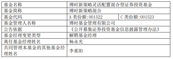 中国经济网北京3月13日讯 今日,博时基金管理有限公司公告称,杨永光离任博时恒盈稳健一年持有期混合(A类013321;C类013322)、博时平衡配置混合(050007)、博时新策略混合(A类001522;C类001523)、博时鑫泰混合(A类004175;C类004176;D类023161)。