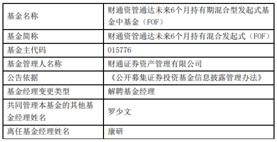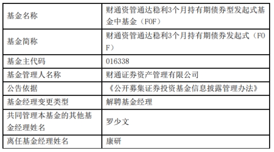 中国经济网北京3月14日讯 今日,财通证券资产管理有限公司公告称,康研离任财通资管通达未来6个月持有混合发起式(FOF)(A类015776;C类015777)、财通资管通达稳利3个月持有期债券发起式(FOF)(A类016338;C类016339)、财通资管通达稳健3个月持有债券发起式(FOF)(A类016080;C类016081)。
