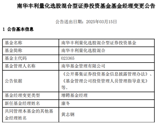 中国经济网北京3月17日讯 近日,南华基金管理有限公司公告称,南华丰利量化选股混合(A类023365;C类023366)增聘基金经理康冬。