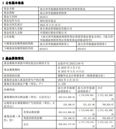 南方泽享稳健添利债券基金成立 规模23.7亿元