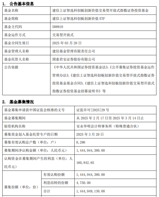 建信上证智选科创板创新价值ETF成立 规模14.4亿元