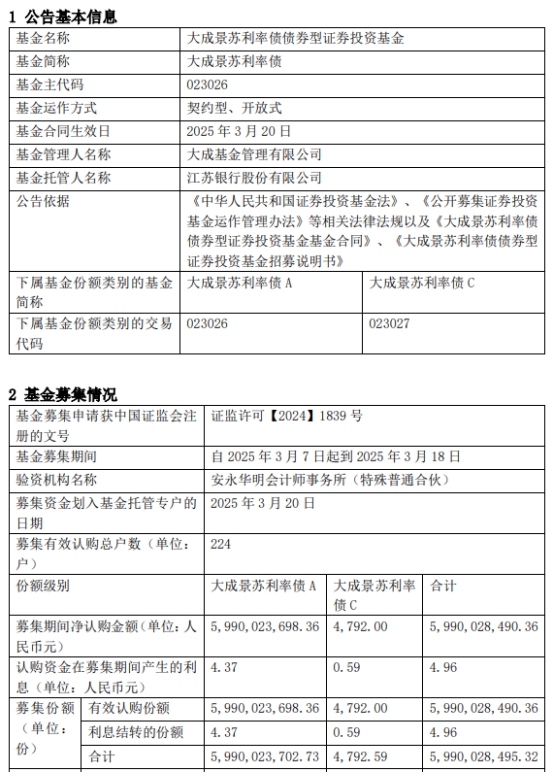 中国经济网北京3月21日讯 今日,大成基金管理有限公司发布关于大成景苏利率债债券型证券投资基金基金合同生效公告。