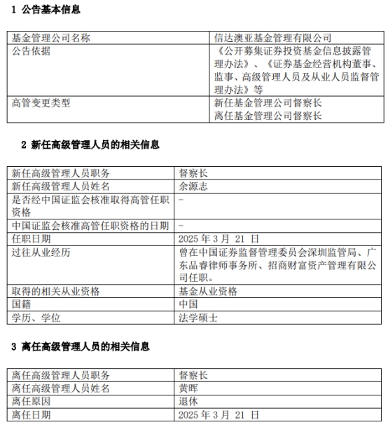信达澳亚基金任命余源志为督察长 黄晖退休