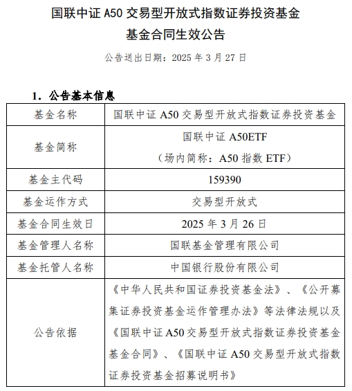 中国经济网北京3月27日讯 今日,国联基金管理有限公司发布国联中证A50交易型开放式指数证券投资基金(简称:国联中证A50ETF)基金合同生效公告。