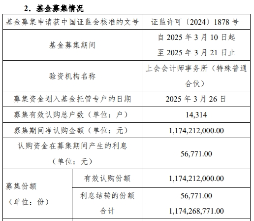 该基金募集期间净认购金额1,174,212,000.00元,认购资金在募集期间产生的利息56,771.00元,募集份额合计1,174,268,771.00份。