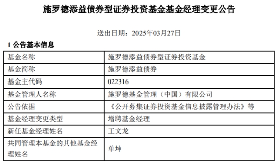 中国经济网北京3月27日讯 今日,施罗德基金管理(中国)有限公司公告称,施罗德添益债券(A类022316;C类022317)增聘基金经理王文龙。