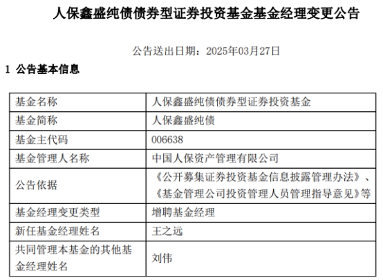 中国经济网北京3月27日讯 今日,中国人保资产管理有限公司公告称,人保鑫盛纯债(A类006638;C类006639;E类022593)增聘基金经理王之远。