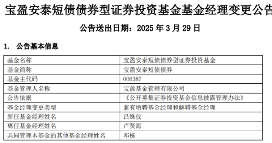 宝盈安泰短债债券增聘吕姝仪 卢贤海离任