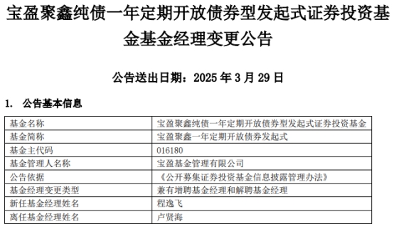 宝盈聚鑫纯债一年定开增聘程逸飞 卢贤海离任