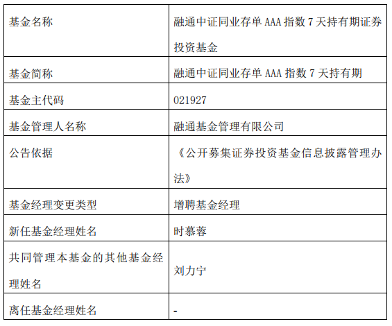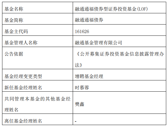 中国经济网北京4月2日讯 今日,融通基金管理有限公司公告称,融通通福债券(A类161626;C类161627;D类021434)、融通中证同业存单AAA指数7天持有期(021927)增聘基金经理时慕蓉。