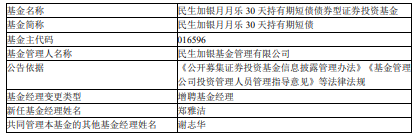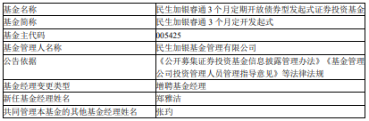 中国经济网北京4月2日讯 今日,民生加银基金公告,民生加银月月乐30天持有期短债、民生加银睿通3个月定开发起式增聘郑雅洁。