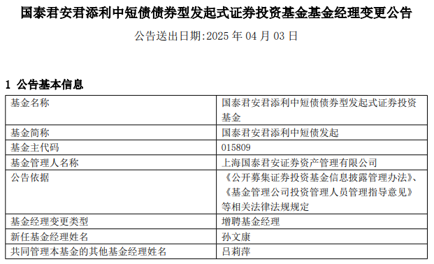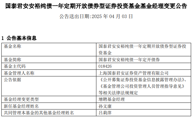 中国经济网北京4月3日讯 今日,上海国泰君安证券资产管理有限公司公告称,国泰君安安裕纯债一年定开债券(018426)、国泰君安君添利中短债发起(A类015809;C类015810;D类018366)增聘基金经理孙文康。