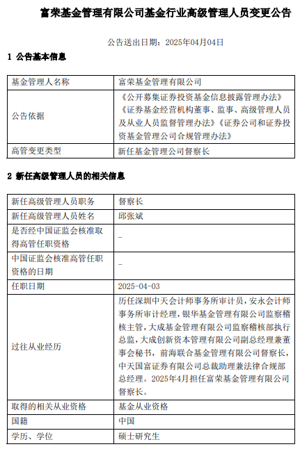 中国经济网北京4月7日讯 近日,富荣基金管理有限公司发布高级管理人员变更公告。公告称,邱张斌任公司督察长。