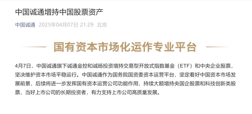 记者从中国诚通控股集团有限公司获悉,4月7日,中国诚通旗下诚通金控和诚旸投资增持交易型开放式指数基金(ETF)和中央企业股票,坚决维护资本市场平稳运行。中国诚通表示,作为国务院国资委资本运营平台,坚定看好中国资本市场发展前景,后续将进一步发挥国有资本运营公司功能作用,持续大额增持央国企股票和科技创新类股票,当好上市公司的长期投资者,有力支持上市公司高质量发展。