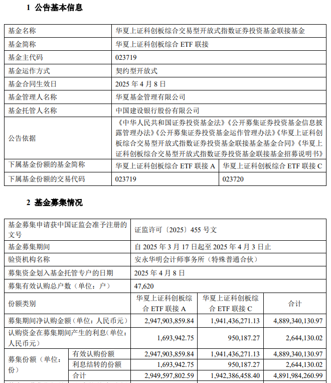 华夏上证科创板综合ETF联接成立 募集净额48.9亿元