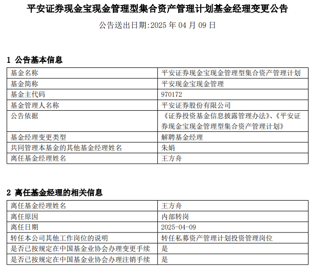 中国经济网北京4月9日讯 今日,平安证券股份有限公司公告称,王方舟离任平安现金宝现金管理(970172),转任私募资产管理计划投资管理岗位。